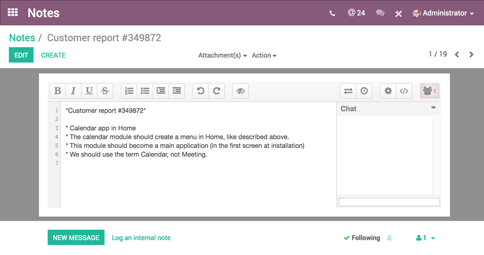 Dù đang họp hay nghiên cứu, việc ghi chú sẽ giúp bạn tập trung và cung cấp cho bạn tài liệu tham khảo sau này để nhắc nhở và củng cố về bối cảnh công việc. Nó có thể tốn ít công sức hơn so với việc viết một bản ghi đầy đủ, nhưng vẫn sẽ mất một lượng lớn thời gian để định dạng, sắp xếp và theo dõi các ghi chú. Mỗi khi cần ghi chú về điều gì đó, bạn nên dùng Odoo Notes.