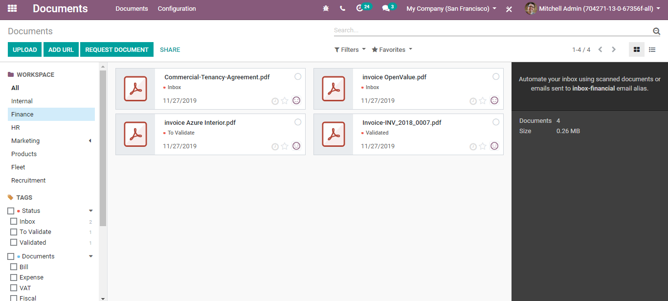 Khi nói đến làm việc từ xa, sự cộng tác không chỉ diễn ra thông qua trò chuyện video mà còn trên các tệp. Đây là lý do tại sao bắt buộc phải có một ứng dụng cho phép các bên liên quan của dự án chia sẻ và chỉnh sửa tệp với nhóm từ xa của họ. Đây là lúc các ứng dụng lưu trữ đám mây như Odoo Documents trở nên hữu ích. Bằng cách chuyển tất cả các tệp lên lưu trữ đám mây, nhóm của bạn sẽ có thể truy cập thông suốt vào các tài liệu, bảng tính, bản trình bày, video có liên quan và nhiều tài liệu khác.