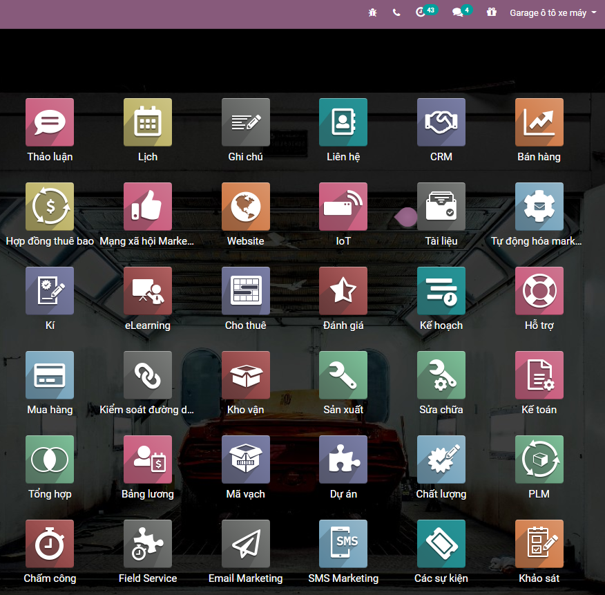 Odoo là ERP tốt nhất với chi phí cực kỳ hợp lý, đáp ứng đầy đủ các nhu cầu kinh doanh, giúp chủ sở hữu điều hành gara của với hiệu suất tốt hơn. Giải pháp phần mềm Odoo cho phép diễn giải hoạt động của nhà để xe ở tất cả các giai đoạn từ cuộc hẹn, sửa chữa, giao xe, ghi nhận toàn bộ các thông tin liên quan tới xe, v.v....