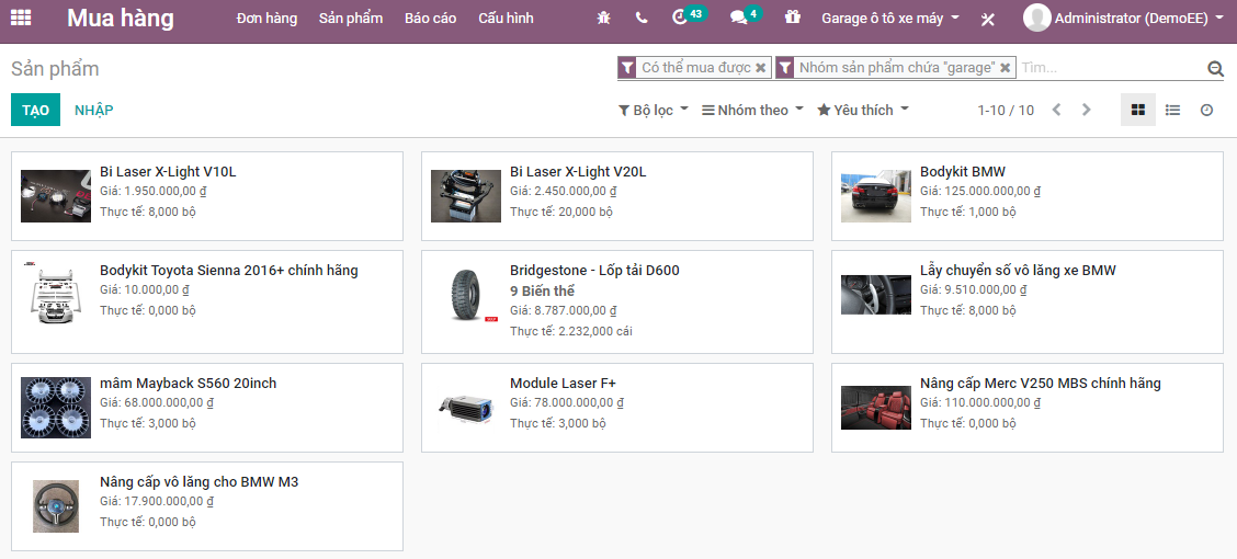 Việc mua hàng trên Odoo có thể thực hiện bởi nhân viên quản lý kho hoặc bộ phận thu mua tập trung (với gara có nhiều chi nhánh).